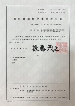 多様な業界向けに、求職者のキャリアアップを重視した総合人材サービスを提供するDissectera株式会社(本社:東京都豊島区、代表取締役:西尾司 以下「当社」)は、有料職業紹介事業の許可を2021年9月1日付で取得し、人材紹介事業を9月1日より開始することをお知らせいたします。